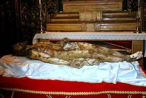 Tras la guerra, sin embargo, apareció en la misma iglesia un bello Cristo yacente en talla exenta, dañada por hachazos, que había pasado inadvertida anteriormente y que fue atribuida inmediatamente a Sánchez Barba por María Elena Gómez Moreno. Otra talla muy semejante, algo afeada por la policromía y también ignorada hasta después de 1939, se encuentra en la iglesia de San José, que lo fue del convento de San Hermenegildo, en el que Sánchez Barba quiso ser enterrado. Consta que en 1650 el escultor se obligó a realizar una imagen del yacente de tamaño natural a imitación del que se encontraba en la Casa Profesa de los jesuitas en Madrid, obra de Gregorio Fernández. Pero estos yacentes de Sánchez Barba, con los que se ha querido relacionar aquel encargo, se apartan del modelo del vallisoletano en muchos aspectos. Mayor semejanza guarda el de la parroquia de Nuestra Señora de la Asunción de Navalcarnero, al que se le han serrado los brazos para la ceremonia del Descendimiento, atribuido recientemente a Sánchez Barba por José Luis Blanco Mozo.