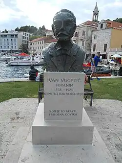 Busto de Vucetich, en el puerto de Hvar.