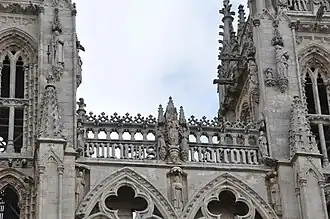 Juan de Colonia, en Burgos, comenzó por elevar en las torres otro cuerpo prismático sobre el existente y por medio de cuatro trompas preparó una plataforma cuadrada y con hueco octogonal en el centro. Sobre ella asentó la aguja en forma de pirámide de ocho caras; rodeó la plataforma con un antepecho calado[22] y apoyado en cuatro grandes pináculos,y adornó todo con inscripciones, estatuas y escudos.