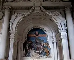En el grupo del Entierro, la Virgen ocupa el espacio central y avanza hacia delante, descansando un brazo de Cristo sobre la rodilla; ambos brazos los tiene abiertos en señal de dolor. Cristo en primer término está colocado casi horizontalmente y se cubre con un pequeño paño, pudiéndose apreciar la magnífica anatomía de su cuerpo. Como en el Entierro de Cristo de Valladolid, se encuentran en total siete personajes, San Juan que se halla detrás de la Virgen con muestras de dolor en el rostro, María Magdalena, que aguanta en una mano el frasco de perfume y con la otra sostiene el sudario; a su lado José de Arimatea, sentado, con los símbolos de la pasión, espinas, clavos y tenazas, al otro lado María Salomé que con una mano levanta su toca. Este es un recurso muy empleado en el clasicismo, y junto a ella Nicodemo, que sostiene el cuerpo de Cristo por medio del sudario. A pesar de lo dramático del tema las líneas empleadas son curvas y dulces; toda la escena está colocada sobre el fondo pintado que representa la ciudad de Jerusalén.[19]