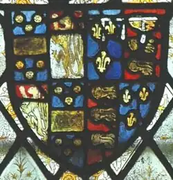 Iglesia de Santa María Virgen, Iffley, Oxfordshire, vidriera del siglo XV con las armas de John de la Pole, Duque de Suffolk (1442–1491/2), KG. Armas: por cuadrantes, 1.º y 4.º: Azure un fess entre tres caras de leopardo o (de la Pole, (aquí con seis caras de leopardo)); 2.º & 3.º: Argent, un jefe gules sobre todo un león rampante con doble cola o (Burghersh de Ewelme); Impaling las armas reales de Inglaterra con etiqueta de tres puntos argent, las armas de su 2.ª mujer Elizabeth de York. Cresta: Un Saracen cabeza gules, barba y oro de cabello, con un jewelled fillet sobre el brows