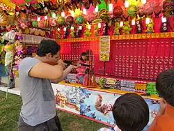 - Esta obra contiene una traducción parcial derivada de «Carnival game» de Wikipedia en inglés, publicada por sus editores bajo la Licencia de documentación libre de GNU y la Licencia Creative Commons Atribución-CompartirIgual 4.0 Internacional.