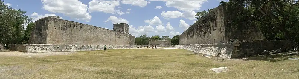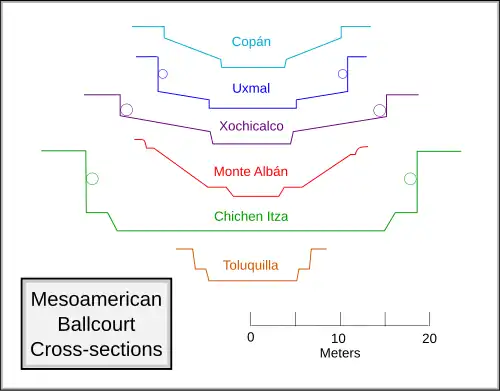 Aunque la relación entre longitud y anchura se mantuvo relativamente constante a 4-a-1,[44] había una enorme variación en el tamaño de los campos de juego. El campo del Gran Juego de Pelota de Chichén Itzá es el más grande con 96,5 metros de largo por 30 metros de ancho, mientras que la Plaza de Ceremonias en Tikal solo tiene 16 metros por 5 metros.[45]