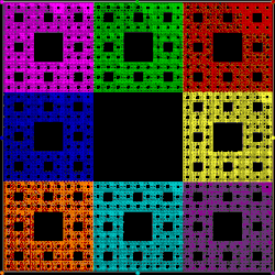 Cuando el salto es 2/3 y el punto también puede saltar hacia los puntos medios de los cuatro lados, el juego del caos genera la alfombra de Sierpinski: