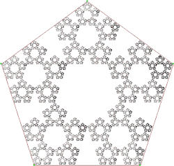 Cuando el salto es 1/phi y el punto salta aleatoriamente hacia uno u otro de los cinco vértices de un pentágono regular, el juego del caos genera un N-copo pentagonal: