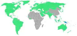 Alemania Occidental, Alemania Oriental, Andorra, Antigua y Barbuda, Antillas Neerlandesas, Arabia Saudita, Argentina, Australia, Austria, Bahamas, Barbados, Bélgica, Belice, Bermudas, Bolivia, Brasil, Bulgaria, Canadá, Checoslovaquia, Chile, Colombia, Corea del Norte, Corea del Sur, Costa de Marfil, Costa Rica, Cuba, Dinamarca, Ecuador, España, Estados Unidos, Fiyi, Filipinas, Finlandia, Francia, Gran Bretaña, Grecia, Guatemala, Guinea, Haití, Honduras, Hong Kong, Hungría, India, Indonesia, Irán, Irlanda, Islandia, Islas Caimán, Islas Vírgenes de Estados Unidos, Israel, Italia, Jamaica, Japón, Kuwait, Líbano, Liechtenstein, Luxemburgo, Malasia, México, Mónaco, Mongolia, Nepal, Nicaragua, Noruega, Nueva Zelanda, Países Bajos, Pakistán, Panamá, Papúa Nueva Guinea, Paraguay, Perú, Polonia, Portugal, Puerto Rico, República Dominicana, Rumania, San Marino, Senegal, Singapur, Suecia, Suiza, Surinam, Tailandia, Trinidad y Tobago, Turquía, Unión Soviética, Uruguay, Venezuela y Yugoslavia.