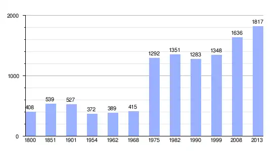 Los datos demográficos contemplados en este gráfico de la comuna de Jugon-les-Lacs[4] se han cogido de 1800 a 1999 de la página francesa EHESS/Cassini, y los demás datos de la página del INSEE.[5]