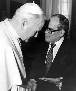 Católico practicante, Marías «tuvo que sufrir tan duras pruebas contra su fe que el haber permanecido en ella constituye una virtud heroica: "Que se vayan ellos"»[16]​era su norma. En «1949 recibió, providencialmente, una suprema orientación del cardenal Suhard, arzobispo de París, que lo iba a confortar frente a tantos ataques. Ese año fue invitado a la Semana de los intelectuales católicos, celebrada en París. El 15 de mayo, en la sesión de clausura, dio una conferencia en la cripta de Sainte-Odile, presidida por el citado cardenal»,[16]​ que murió poco después y cuyo pensamiento se anticipaba al Concilio Vaticano II, a cuya tercera sesión fue invitado el propio Marías en 1964. «Que las virtudes de Julián Marías han sido heroicas consta para muchos».[17]​ Cuando Juan Pablo II creó el Pontificio Consejo para la Cultura, en 1982, nombró a Julián Marías, debido a su prestigio, uno de sus doce miembros, representantes de grandes porciones del mundo, el único de lengua española.