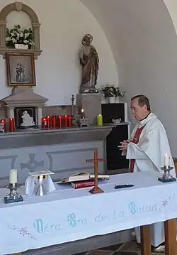![]() Julio Eugui celebrando misa de montaña en la ermita de la Virgen de la salud en Aliva (Cantabria), Picos de Europa | ||