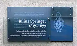 (Julius Springer, 1817–1877, editor, fundó aquí el 10 de mayo de 1842 Springer-Verlag, hoy uno de las casas editoriales científicas más grandes del mundo.)