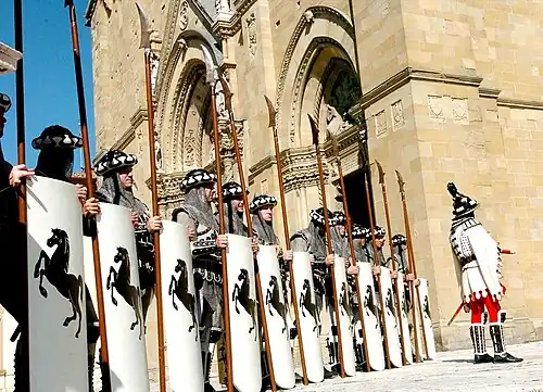 En este momento, ingresan los participantes de los cuatro Barrios, precedidos de los respectivos Rectores (el cargo más alto de un Barrio) y de los portadores de los emblemas de las Casas asociadas a los barrios. El cortejo de cada Barrio consta de un paje (normalmente representado por un niño), 2 tamborines, los portadores de los blasones de las respectivas Casas, así como 12 caballeros armados y otro tanto de ballesteros a las órdenes de un Maestro de Armas. Sucesivamente hacen su ingreso los Capitanes de los Barrios.