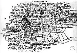Königsberg (pronunciado /ˈkøːnɪçsˌbɛɐ̯k/ (ⓘ); Keenigsbarg en bajo prusiano), hispanizado como Regimonte;[2][3] fue la capital de Prusia Oriental desde la Baja Edad Media hasta 1945, cuando fue tomada por los soviéticos y renombrada como Kaliningrado, capital del óblast homónimo. Fundada por la Orden Teutónica, fue una importante ciudad portuaria situada en un enclave en la desembocadura del río Pregolia, que desemboca en la laguna del Vístula, comunicado a su vez con el mar Báltico por el estrecho de Baltisk.