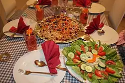Kabuli pulao acompañado de una ensalada en el centro de una mesa (la forma tradicional de consumirlo es sobre un dastarkhān).