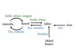 En el segundo milenio a. C., el dinero aún no se había inventado. Los comerciantes asirios utilizaban oro para el comercio al por mayor y plata para el comercio minorista. El oro era considerado ocho veces más valioso que la plata. Pero había otro metal, el amutum, que era aún más valioso que el oro. Se piensa que el amutum fuera el hierro recién descubierto y valía cuarenta veces más que la plata. La más importante de las exportaciones de Anatolia fue el cobre y los mercaderes asirios, a su vez, vendían principalmente estaño y ropa.[6]