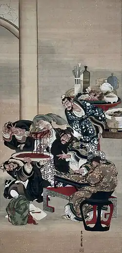 - Tres mujeres tocando instrumentos musicales (c. 1818–1844, es decir, era Bunsei a la era Tenpō) - Pergamino colgante; tinta y color sobre seda. Colección del Museo de Bellas Artes, Boston.