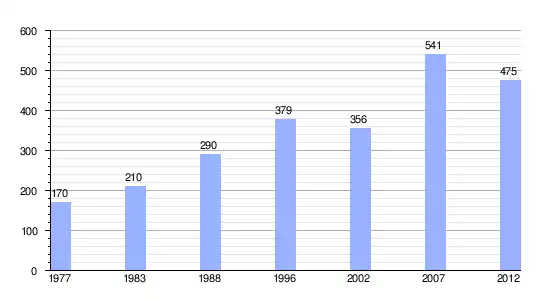 | Gráfica de evolución demográfica de Kaukura entre 1977 y 2012 |