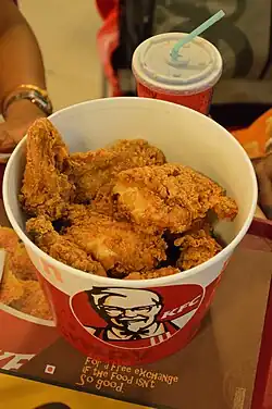 KFC Corporation, conocida oficialmente por sus siglas KFC y también por su nombre histórico Kentucky Fried Chicken, es una cadena de restaurantes de comida rápida estadounidense especializada en pollo frito. Con sede en Louisville, Kentucky, es el segundo mayor grupo mundial de restauración por detrás de McDonald's, con más de 30 000 locales franquiciados en 150 países.[2][3][4]KFC es una empresa subsidiaria de Yum! Brands.