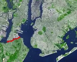 ![]() Vista de satélite: el Kill Van Kull (en rojo) conecta las bahías de Newark y Upper New York | ||