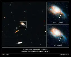 - ↑ Tanvir, N. R.; Levan, A. J.; Fruchter, A. S.; Hjorth, J.; Hounsell, R. A.; Wiersema, K.; Tunnicliffe, R. L. (2013). «A 'kilonova' associated with the short-duration γ-ray burst GRB 130603B». Nature 500 (7464): 547-9. Bibcode:2013Natur.500..547T. PMID 23912055. arXiv:1306.4971. doi:10.1038/nature12505.