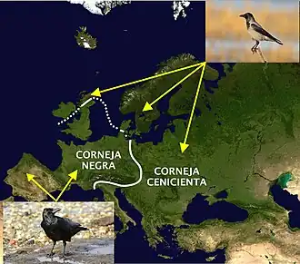La corneja negra (Corvus corone) y la corneja cenicienta (Corvus cornix) son dos especies estrechamente relacionadas entre sí, cuya distribución geográfica en Europa se ilustra en el diagrama adjunto. Se cree que esta distribución podría haber sido el resultado de los ciclos de glaciación durante el Pleistoceno, lo que causó que la población parental se dividiera en zonas aisladas que posteriormente se expandieron de nuevo cuando el clima se calentó y causó un contacto secundario.[47][61] Jelmer W. Poelstra y sus compañeros de trabajo secuenciaron casi todos los genomas de ambas especies en poblaciones a diferentes distancias de la zona de contacto para encontrar que las dos especies eran genéticamente idénticas, tanto en su ADN como en su expresión (en forma de ARN), excepto por la falta de expresión de una pequeña porción (<0.28%) del genoma (situado en el cromosoma 18 aviar) en la corneja cenicienta, que produce la coloración más clara del plumaje en su torso. Por lo tanto, las dos especies pueden hibridarse de manera viable, y ocasionalmente lo hacen en la zona de contacto, pero las cornejas completamente negras en un lado de la zona de contacto se aparean casi exclusivamente con otros individuos completamente negros, mientras que lo mismo ocurre entre los de color ceniciento al otro lado de la zona de contacto. Por lo tanto, está claro que es solo la apariencia externa de las dos especies lo que inhibe la hibridación. Los autores atribuyen esto al emparejamiento selectivo, cuyas ventajas no están claras, que conduciría a la rápida aparición de corrientes de nuevos linajes, y posiblemente incluso especies, a través de la atracción mutua entre mutantes. Unnikrishnan y Akhila[62] proponen en cambio, que la koinofilia es una explicación más precisa de la resistencia a la hibridación en la zona de contacto, a pesar de la ausencia de barreras fisiológicas, anatómicas o genéticas para dicha hibridación.