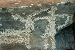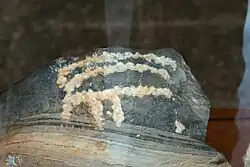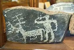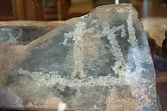 ![]() Una de las losas de Korfí t' Aronioú, que parece representar una embarcación con dos tripulantes, quizá luchando. Colección Arqueológica de Apératos. | ||