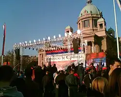 Las reacciones en Serbia y el resto del mundo ante la independencia de Kosovo no se hicieron esperar. El 21 de febrero de 2008, una gran manifestación denominada "Косово је Србија / Kosovo je Srbija" ("Kosovo es Serbia"); se celebró en Belgrado, organizada por el gobierno serbio. Muchos de los manifestantes agitaban banderas serbias, y otros símbolos contra Estados Unidos y la Unión Europea.[8] Al final del acto se produjeron graves incidentes, y fueron atacadas las embajadas de Estados Unidos, Turquía, Croacia y el Reino Unido.[9] Destacadas personalidades serbias del mundo del arte, la cultura, la política y el deporte se adhirieron a la campaña y participaron en la manifestación: