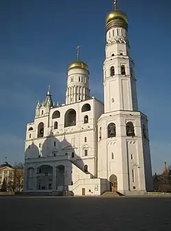 El último edificio notable de la plaza es el Campanario de Iván el Grande, situado en su esquina noreste, que se dice que marca el centro exacto de Moscú y parece una vela encendida. Completado en 1600, tiene 81 metros de altura. Hasta la Revolución rusa, era la estructura más alta de la ciudad, ya que estaba prohibida la construcción de edificios más altos que él. Sus veintiuna campanas daban la alarma si se acercaba cualquier enemigo. La parte superior de la estructura fue destruida por los franceses durante la invasión napoleónica en 1812 y ha sido reconstruida. La Campana del Zar, la campana más grande del mundo, se encuentra en un pedestal junto a la torre.