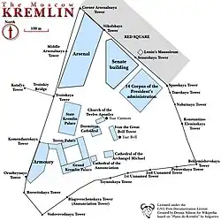 El Kremlin de Moscú (en ruso: Московский Кремль, romanizado: Moskovskiy Kreml', pronunciado [mɐˈskofskʲɪj ˈkrʲemlʲ]), también designado por antonomasia como el Kremlin (pronunciación en ruso: [ˈkrʲemlʲ] (ⓘ)),[1] es un complejo fortificado de Moscú (Rusia).[2] Situado en el centro de la ciudad, el Kremlin de Moscú contiene cinco palacios, cuatro catedrales y la muralla que lo rodea, junto con las torres del Kremlin. Dentro del complejo está el Gran Palacio del Kremlin, que antiguamente fue una de las residencias del zar de Rusia y actualmente es la residencia oficial del presidente de Rusia. El Kremlin de Moscú tiene vistas del río Moscova al sur, de la catedral de San Basilio y la Plaza Roja al este, y de los Jardines de Alejandro al oeste.