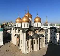 La plaza de las Catedrales es el corazón del Kremlin y está rodeada por seis edificios, incluidas tres catedrales. La catedral de la Dormición fue completada en 1479 como la iglesia principal de Moscú, donde serían coronados todos los zares. Su enorme fachada de caliza, rematada con cinco cúpulas doradas, fue diseñada por Aristóteles Fioravanti. Varios metropolitanos y patriarcas están enterrados en ella, incluidos Pedro y Macario. La catedral de la Anunciación fue completada a su lado en 1489 con tres cúpulas doradas, aunque un siglo más tarde sería reconstruida con un diseño de nueve cúpulas. En el sureste de la plaza está la catedral del Arcángel Miguel (1508), mucho más grande, donde están enterrados casi todos los monarcas moscovitas desde Iván I Kalitá hasta Iván V de Rusia. También Borís Godunov fue enterrado originalmente en ella, pero fue trasladado posteriormente al monasterio de la Trinidad.