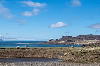 Se encuentra en una pequeña península entre varios estuarios. El pueblo más cercano es Reykhólar. Solo media parte conserva el volcán, ya que la otra parte está bajo el mar.