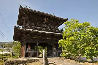 El niōmon (puerta niō) del Kumadani-ji es el más grande de los 88 templos del Camino de Shikoku, con 9 m de ancho y 12,3 m de alto. La puerta fue construida en 1687 mezclando el estilo japonés y el chino Tang. Los guardianes se encuentran a ambos lados de la entrada y se caracterizan por el pigmento rojo de su piel con ropa blanca ondulante. Otros edificios del templo son el tahōtō (pagoda de dos pisos) construido en 1774, una segunda puerta con guardianes con armaduras de estilo chino, un campanario, el salón principal y el salón Daishi, construido en 1707.[4]