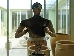 Las piernas de la figura se encontraron frente a una pared de la habitación 2 del edificio 5, que se interpreta como un santuario y en el que se encontraron un ánfora y dos copas. Las otras partes de la estatuilla, como el torso, la cabeza, los ojos, la mitad delantera de los pies y los restos de la base se encontraron en la entrada a la sala 1 del mismo edificio, una platea abierta situada al noroeste del edificio 1.