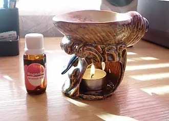 - Lámparas de vela, que utilizan una pequeña vela bajo un recipiente para vaporizar una mezcla de agua y aceite.