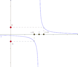 Como ejemplo, tomemos la función racional , cuya gráfica en el plano es una hipérbola equilátera centrada en el origen de coordenadas. Tomando x muy cercano a cero, la función f(x) toma valores muy grandes, por eso se dice que f(x) tiende a infinito cuando x tiende a cero. Esto puede demostrarse con la definición.