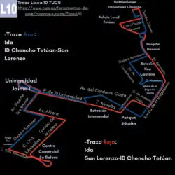 - ↑ Dependiendo de la fecha y/o la hora, la línea 10 en dirección al Grupo San Llorenzo comenzará ya sea en Tetuan o en Ciudad Deportiva