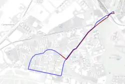 Dentro de la colonia, recorría la calle Rafael Finat hasta la intersección con la Avenida de la Aviación, donde giraba a la derecha para incorporarse a esta, que recorría hasta girar de nuevo a la derecha por la calle Mirabel, por la que llegaba a la Plaza de Cuacos de Yuste, salía de esta por la calle Oliva de Plasencia, que desembocaba en la calle de Blas Cabrera, donde tenía su cabecera.