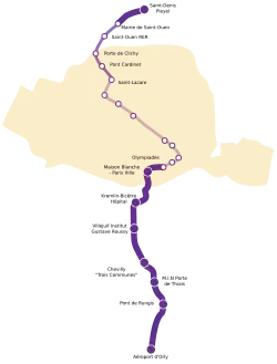- 24 de junio de 2024: extensión de la línea al norte entre Mairie de Saint-Ouen y Saint-Denis-Pleyel, y al sur entre Olympiades y Aéroport d'Orly