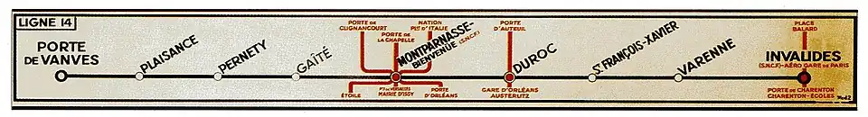 Hasta 1976 existió una primera línea 14, que unía las estaciones de Invalides y Porte de Vanves. Hoy en día, su trazado lo ha retomado la línea 13 gracias a un túnel entre las estaciones de Invalides y Saint-Lazare por Miromesnil.