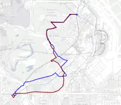 Al final de la calle Playa de América, la línea desemboca en la calle Playa de Riazor, que recorre hasta llegar al cruce con la calle de Arroyomolino. Toma dicha vía para luego girar a la izquierda por la calle Alhaurín, desembocar en la avenida de Logroño y volver a Playa de Riazor, junto a la estación de Barajas de Metro de Madrid, donde tiene su cabecera.