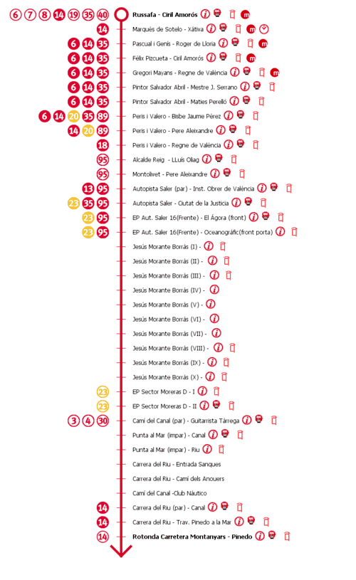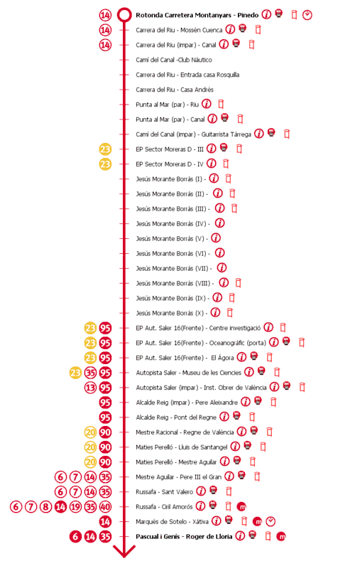 Tenía la cabecera en la rotonda de Montanyares en Pinedo, y la otra está en la calle de Castelló. Además del centro también conecta con el la misma puerta del Oceanográfico, la Ciudad de las Artes y de las Ciencias, la Ciudad de la Justicia, el ambulatorio de Montolivete y el mercado de Ruzafa. Tiene una frecuencia de 100 min.