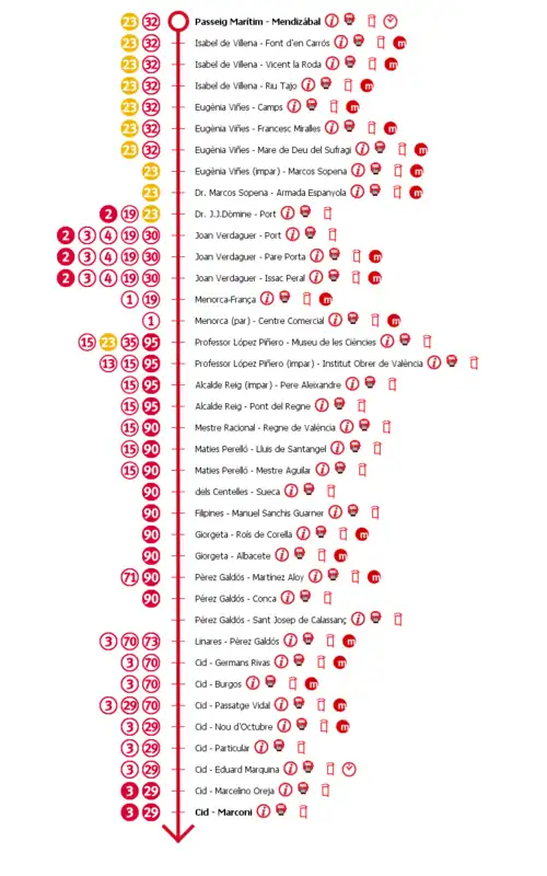 La línea 20 Av. del Cid - Marina Reial - Platges de EMT de Valencia es una de las dos líneas especiales a las playas, y que solo funciona en periodo estival.