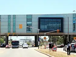 Línea 214 circulando por debajo del Costa Urbana Shopping sobre la Avenida Luis Giannattasio .