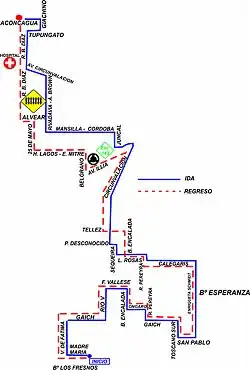 IDA: Madre María, Virgen de Fátima, Gaich, Río Quinto, Felipe Vallese, Blanco Encalada, Ongaro, Pereyra, Gaich, Toscano (S), San Pablo, Smitch, Calegaris, Pereyra, Rosas, Sequeira, Circunvalación, Juncal, Córdoba, Mansilla, Rivadavia, Almirante Brown, Avda. Circunvalación, Díaz, Tupungato, Giachino, Aconcagua.