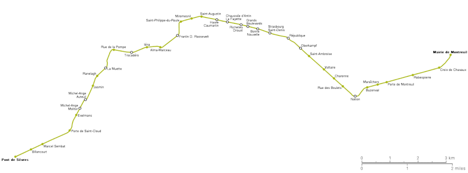 La línea 9 del Metro de París une las estaciones de Pont de Sèvres y Mairie de Montreuil. Esta línea, una de las más largas de la red, atraviesa el suroeste, el centro y el este de París.