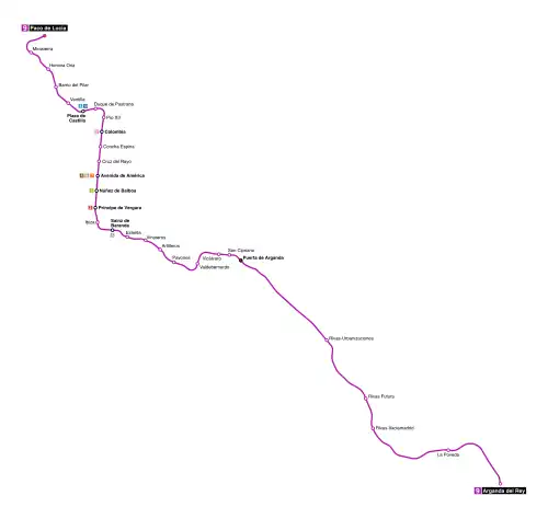 La línea nace en pleno corazón del distrito de Fuencarral-El Pardo, de donde se dirige al sur siguiendo las ejes Ginzo de Limia, Avenida de Asturias, Mateo Inurria, Caídos de la División Azul, Pío XII, Príncipe de Vergara y Menéndez Pelayo. A la altura de la calle Ibiza abandona el eje y se dirige hacia los distritos de Moratalaz y Vicálvaro, continuando más allá hacia las ciudades de Rivas-Vaciamadrid y Arganda del Rey, si bien los viajeros deben transbordar en la última estación de Madrid, Puerta de Arganda. Conecta con: