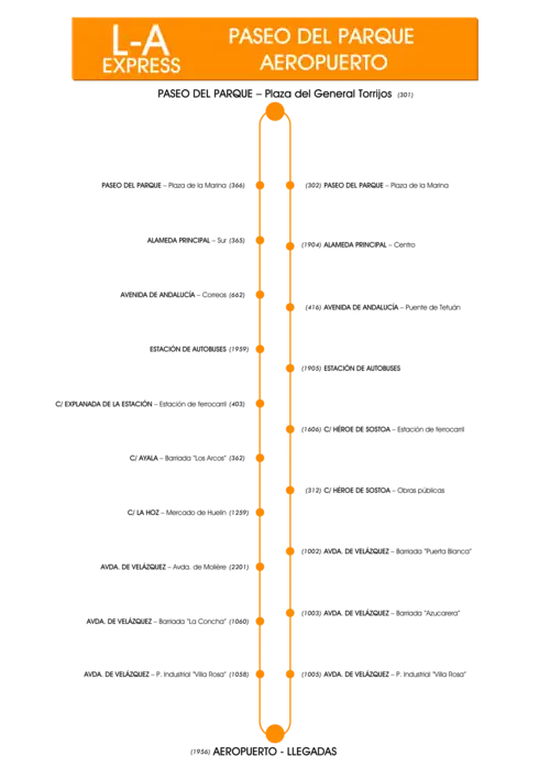 Desde la cabecera en Llegadas, toma de nuevo la avenida del Comandante García Morato para salir del Aeropuerto, cruza la avenida de Velázquez sobre el puente del Cruce del Aeropuerto para tomarla sentido centro. Cruza toda esta avenida, sigue el recorrido por la avenida de la Paloma, calle La Hoz, calle Ayala, y al final de esta gira a la izquierda para llegar a la estación de autobuses. Saliendo de esta, sigue por el paseo de los Tilos, Callejones del Perchel y finalmente, al final de esta vía, gira a la derecha en la rotonda para tomar la avenida de Andalucía, la Alameda y el paseo del parque y poner fin a su recorrido en la cabecera de la plaza del General Torrijos.