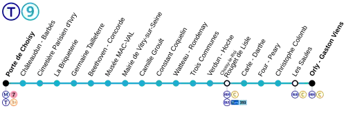 La Línea T9 de tranvía es una línea de la red de Tranvía de la Île de France , que transcurre a lo largo de la carretera departamental nº 5 (antigua RN-305) sustituyendo a la línea de autobús 183 de la RATP . Une Porte de Choisy (París) a Orly . Entró en servicio el 10 de abril de 2021.