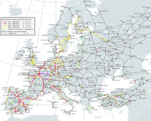 La siguiente tabla[nota 1] muestra las líneas de nueva construcción que operan a velocidades de al menos 250 km/h, en servicio y en construcción, ordenadas por país, según la UIC.[20] Las líneas en proyecto, con plazos de realización variables y construcción no garantizada, no se han incluido.
