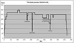 | Velocidad Máxima de la Línea | 290 km/h (solamente 12 km en la recta de Los Yébenes) y 300 km/h (solamente 8 km de los 10 km recta de Los Yébenes) |
