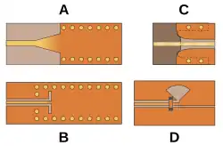 | Finline | LSE, LSM | 220 GHz[26] | 10–400 Ω at εr = 10[22] | 550 at 30 GHz, εr = 10[22] |